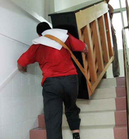 4、如果鋼琴要搬上樓,最好也要有四至五個人。首先要保證搬琴人的安全,同時鋼琴不能碰撞、劃蹭,外表的保護(hù)重于內(nèi)部。鋼琴的背面朝墻壁,鍵盤朝樓梯的扶手。兩人在下,三人在上,最好用寬布帶挎在肩上兜住鋼琴的車腳。同時用手抓住琴背的把手和鍵盤底下(不能拉鋼琴的腿),抬起鋼琴一鼓作氣搬上一層樓再休息。特別要注意的是,鍵盤的一側(cè)不能碰扶手,車腳不能碰樓梯。到一層樓面拐彎時要當(dāng)心碰撞、調(diào)整好方向然后再抬起往上搬。進(jìn)房門時,也要當(dāng)心蹭著門框,保證最后安全地把鋼琴放到安排好的位置上。